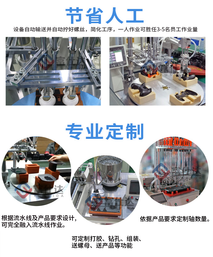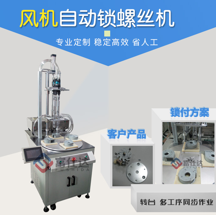 罩極風機外殼采用6顆螺絲緊固,這里配置3臺自動送釘機,并設計專用治具來固定工件,保證鎖付標準。設備可一次自動擰好產品的6顆螺絲,轉臺可實現多工位同步作業,擰好一件產品僅需3秒左右,一人作業即可,可節省3-5名員工。